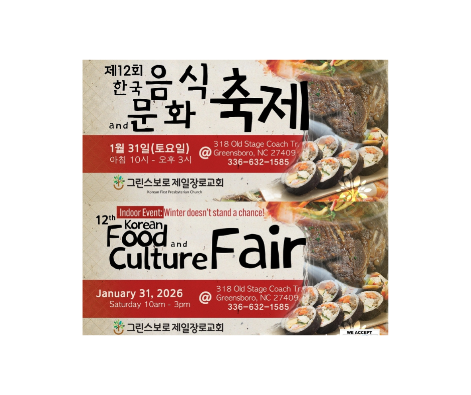 그린스보로 한인 커뮤니티의 대표적인 문화 행사 중 하나인 ‘제12회 Korean Culture & Food Fair’가 그린스보로 제일장로교회(담임 김기석 목사)에서 오는 31일 개최된다.  오전 10시부터 오후 3시까지 진행되는 이날 행사는 한식 음식과 한국 문화를 지역 주민들에게 소개하고 체험할 수 있는 대표적 연례 이벤트로 꾸준한 인기를 누리고 있다.