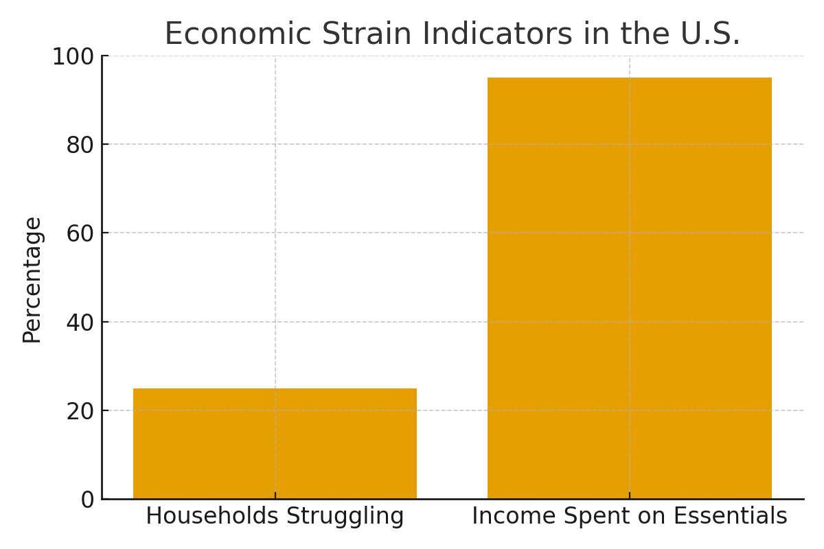 BAI 자료에 따르면, 저소득층 가구의 약 29%가 월급 대부분을 생활 필수비용으로 사용하는 상태에 놓여 있으며 이는 2024년보다 소폭 증가했고 2023년(27.1%)과 비교해서도 상승한 수치다. BAI눈 주거비, 휘발유, 식료품, 공공요금, 인터넷 비용 등 생계 필수 지출이 가계 소득의 95%를 넘는 경우를 ‘월급에 의존해 근근히 먹고 사는 가구’로 정의한다. 2025년 전체 미국 가구의 약 4분의 1이 이러한 상황에 처한 것으로 추정되며 여러 요인이 이러한 재정 악화를 설명한다. 첫 번째 이유는 올해 미국의 연간 물가상승률이 4월 2.3%에서 3%로 다시 상승세를 보였기 때문이다. 소비자물가 상승률은 2022년 코로나19 팬데믹 시기 정점이었던 9.1%보다는 크게 낮아졌지만, 여전히 연준(Fed)의 목표치인 2%를 웃돌고 있다.