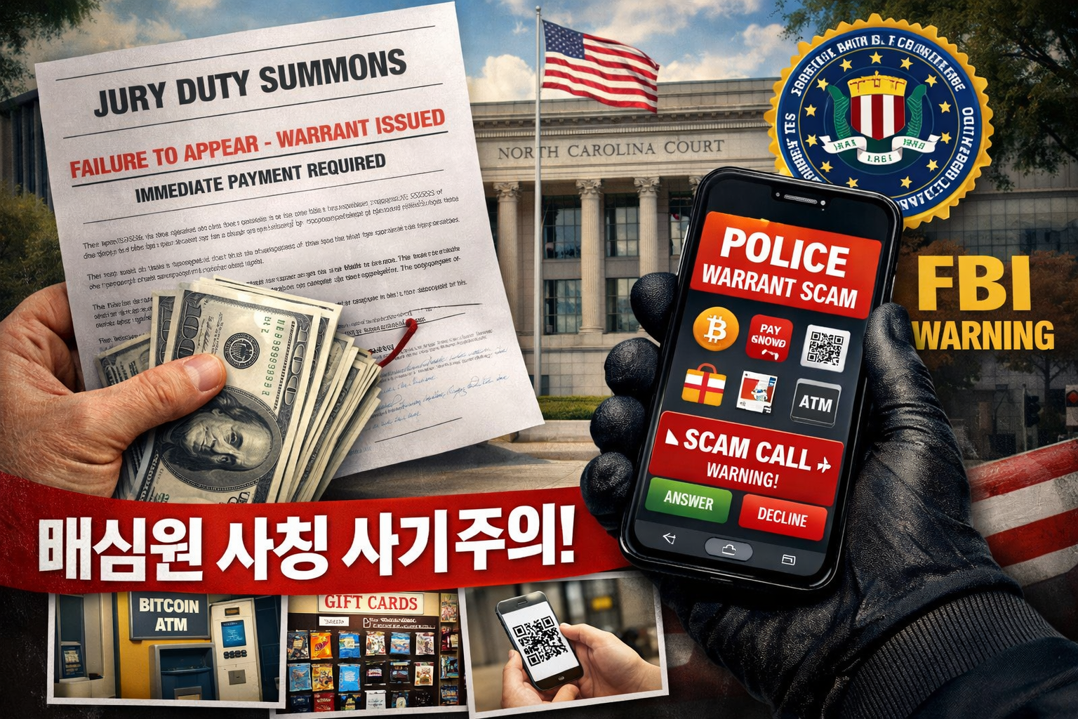 연방수사국(FBI)과 미 연방검찰, 노스캐롤라이나 법원 행정처 등은 최근 “배심원 출석을 하지 않아 체포영장이 발부됐다”고 협박하며 벌금 납부를 요구하는 사기 사례가 주 전역에서 보고되고 있다고 경고했다.