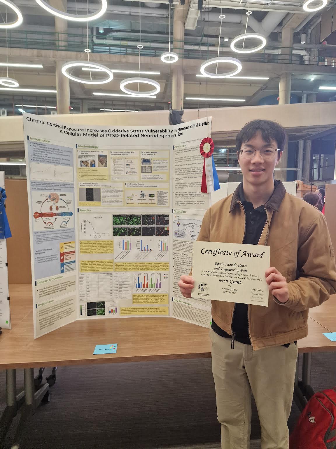 이번 수상 연구 제목은 ‘PTSD 관련 신경퇴행의 세포 모델(A Cellular Model of PTSD-Related Neurodegeneration)’로, 외상 후 스트레스 장애(PTSD)와 관련된 신경퇴행 과정을 세포 수준에서 분석한 분자신경과학 연구다. 이 상은 대회에 참가한 모든 STEM 프로젝트 중 연구 독창성과 학문적 파급력이 가장 뛰어난 전시에 수여되는 대표적인 기관상이다.