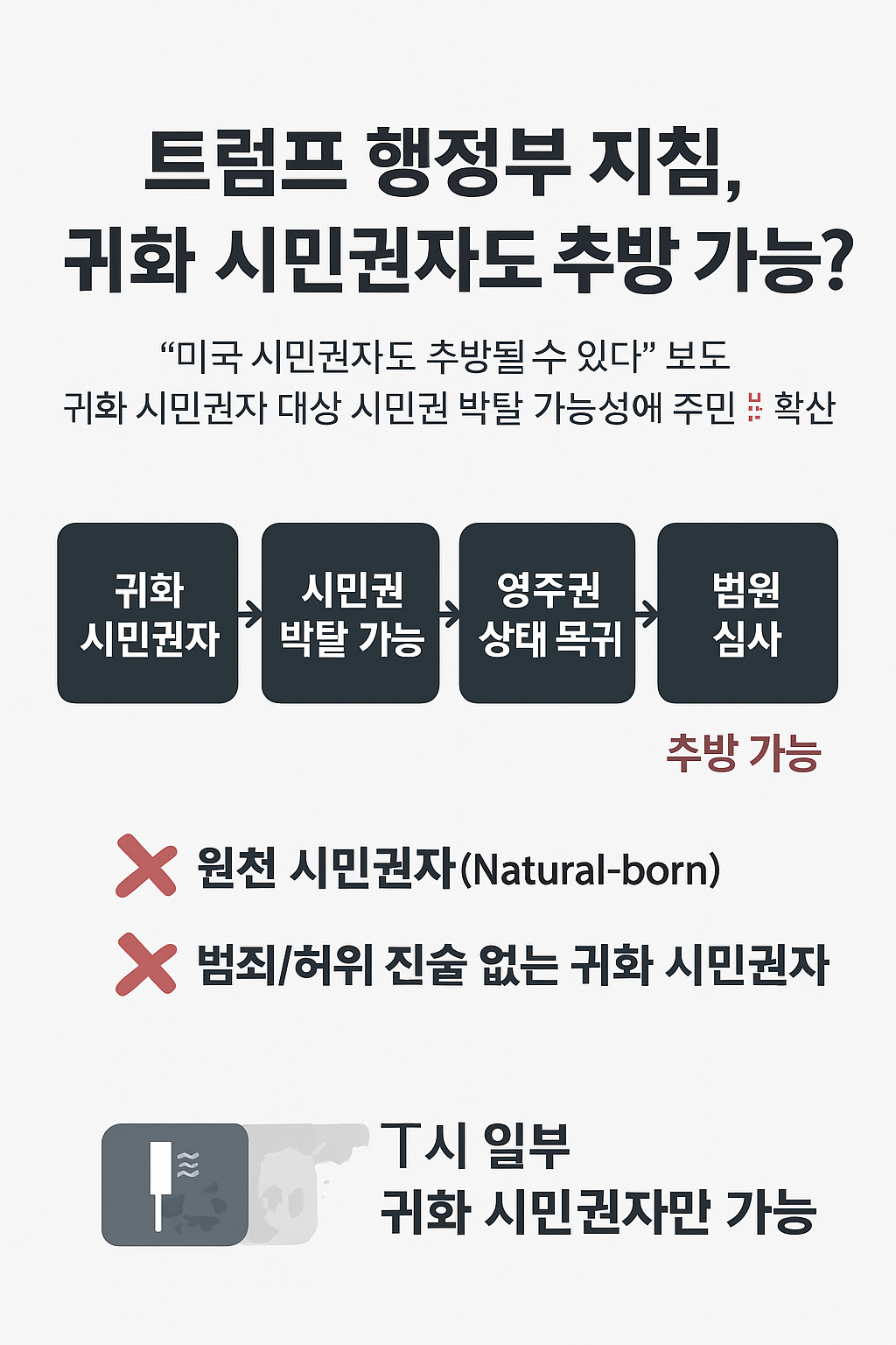 한편 미국 시민권자 추방 가능성 구조는 다음과 같다. 귀화 시민권자 → 시민권 박탈 가능 → 영주권 상태 복귀 → 법원 심사 → 추방 가능