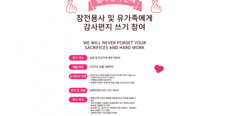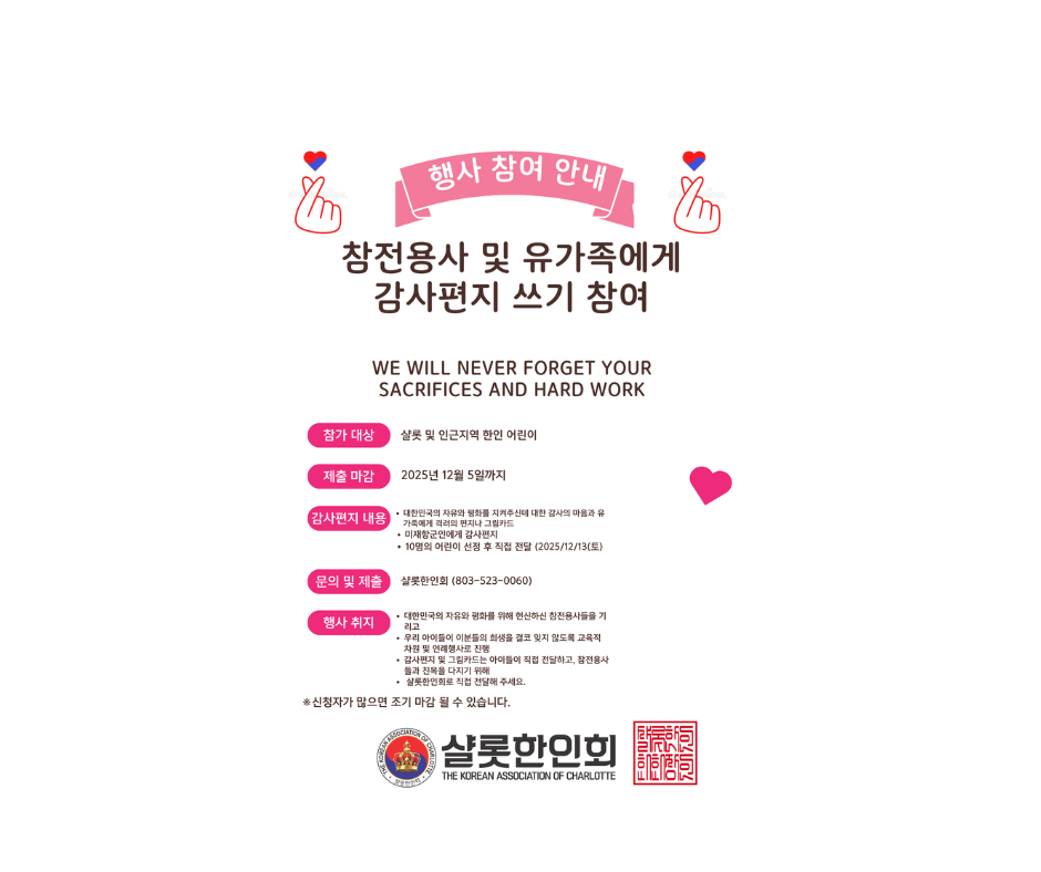 샬롯한인회(회장 남사라)가 샬롯 및 인근지역 한인 어린이들을 대상으로 미재항군인에게 감사편지쓰기 행사를 진행한다.
