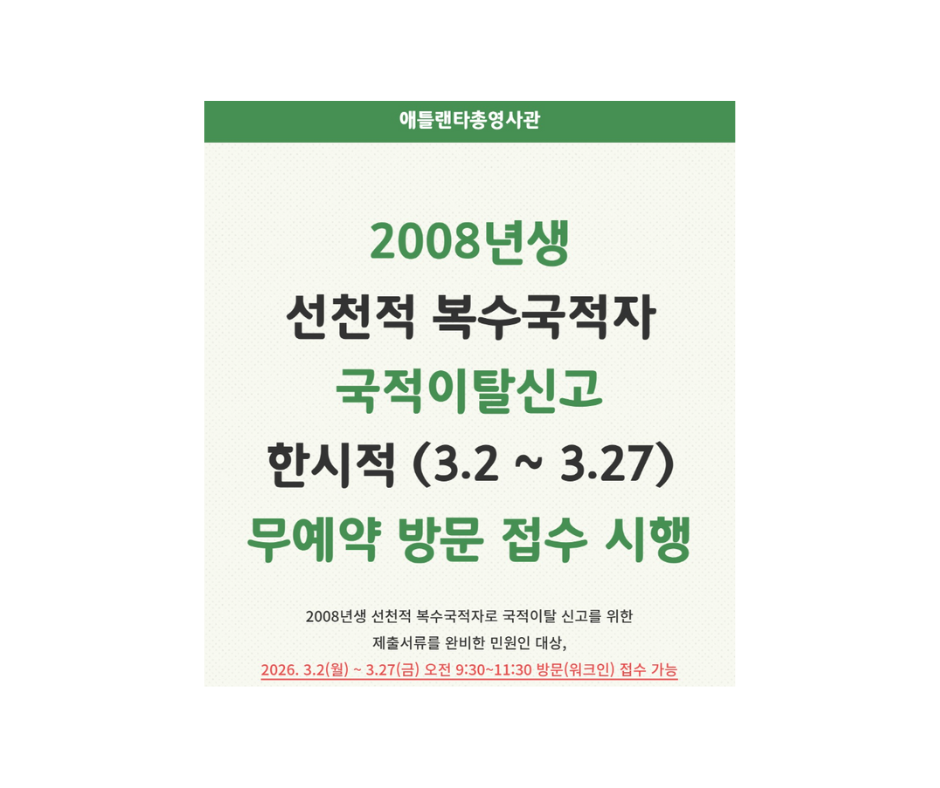 미국 동남부 지역 한인 동포들의 민원 편의를 위해 주애틀랜타총영사관(총영사 이준호)이 2008년생 선천적 복수국적자에 한해 국적이탈 신고를 무예약 방문으로 접수하는 한시적 조치를 시행한다.