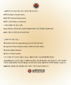 샬롯, NC — 최근 샬롯을 중심으로 이민세관단속국(ICE)의 단속 활동이 강화되면서 이 지역 이민자 커뮤니티가 크게 술렁이고 있다. 샬롯한인회(회장 남사라)의 경우는 한인 커뮤니티의 소통창구인 단톡방에 긴급상황 발생시 알아두면 용의한 가이드라인을 비롯해 구금된 이들을 위한 법적 지원기관, 묵비권, 변호사 선임권, 영장요구권 등에 관해 자세한 안내사항을 게재했다.